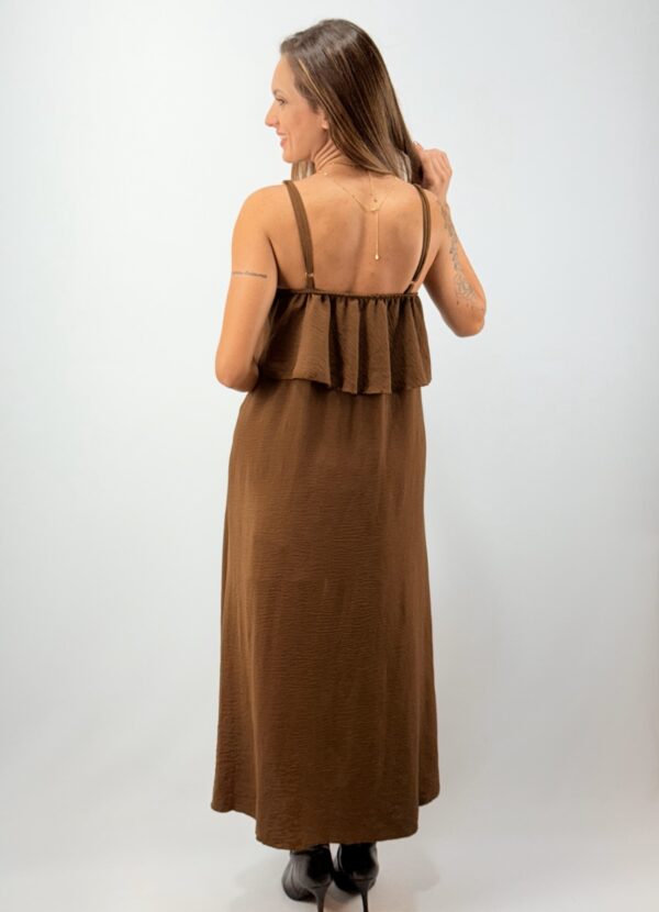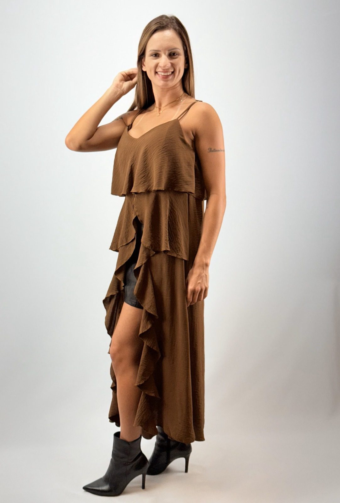 Características do Produto: tecido leve e texturizado, modelo boho, com bojo, alças com regulagem, babado frontal e posterior, corte assimétrico, cor marrom.