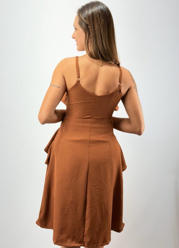 Características do Produto: blusa bata estilo boho, com babados, alça com regulagem, bojo embutido, laço no busto, modelagem mullet, tecido leve, cor marrom.