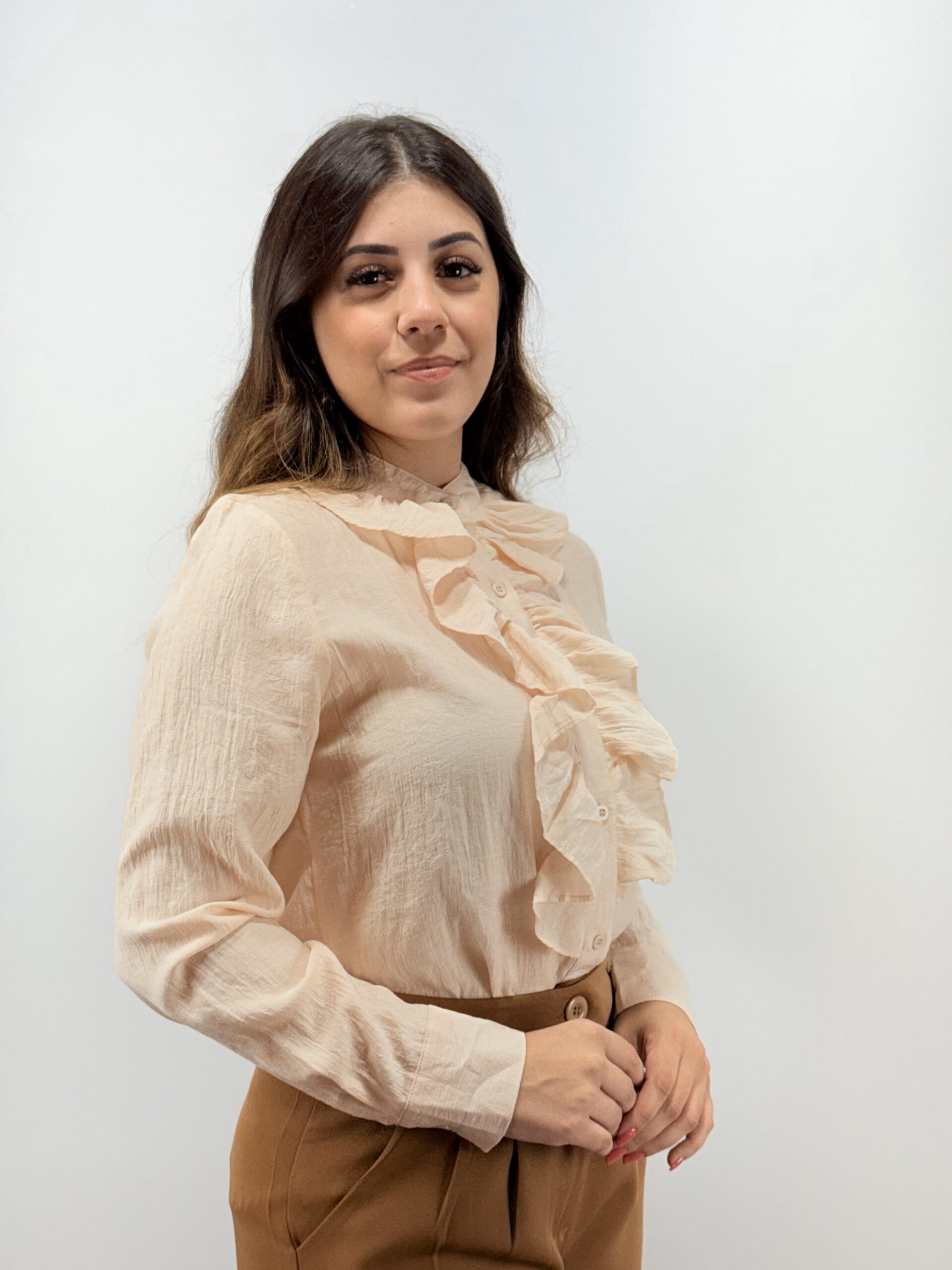 Confeccionada em um tecido viscose leve e texturizado, oferecendo um toque suave e um caimento fluido. A textura sutil do tecido adiciona um charme extra á peça. A cor creme da camisa é suave e versátil, fácil de combinar com outras peças e perfeito para diversas ocasiões. No trabalho combine com uma calça de alfaiataria e sapatos de salto para um look profissional e elegante. Eventos especiais use com um saia midi e acessórios sofisticados para um visual romântico e refinado. Passeios casuais combine com jeans e sapatilhas para um look casual chic e confortável.
