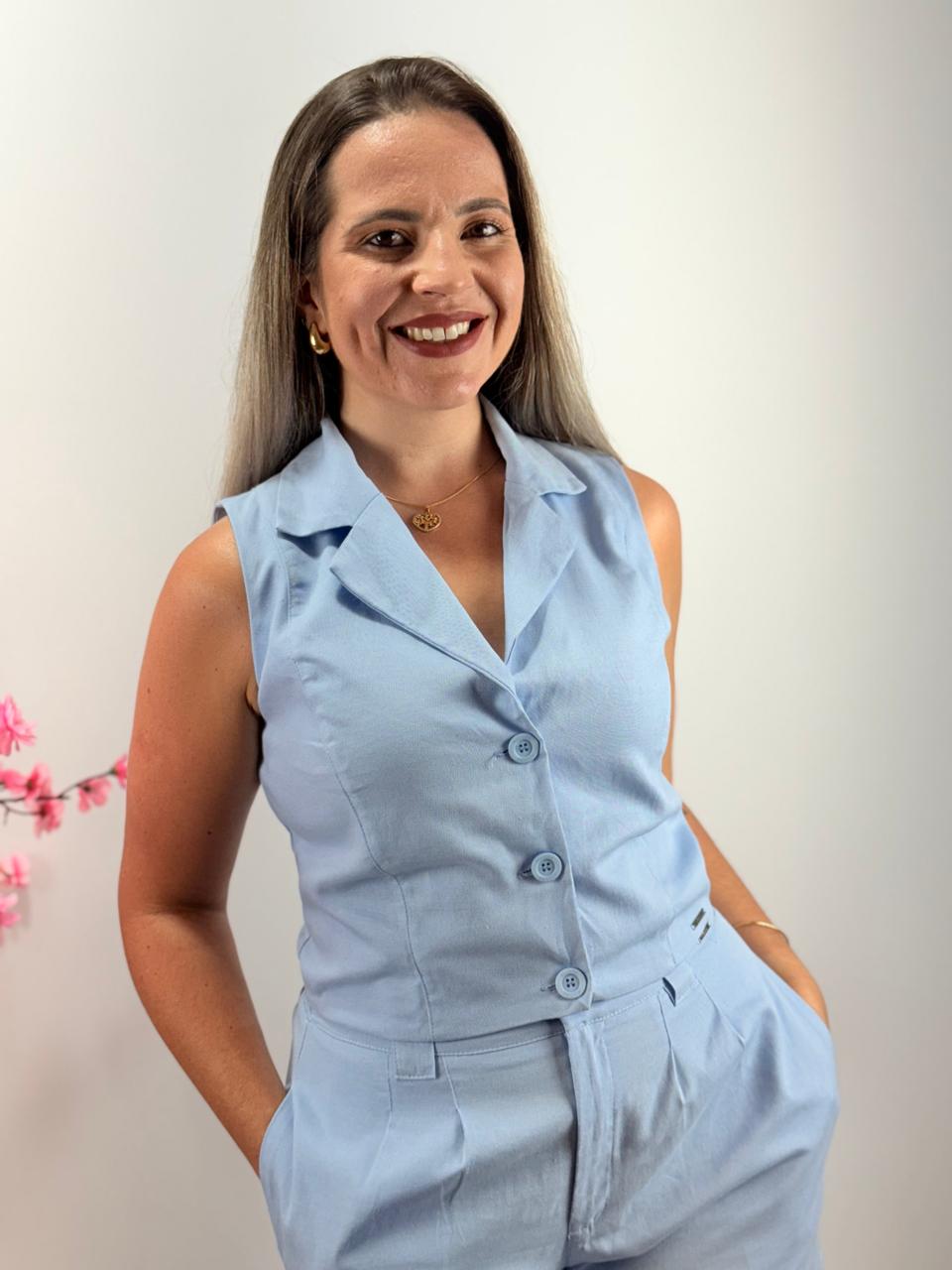Descrição inicial: O Colete de Linho com Gola e Botões é uma peça sofisticada que adiciona um toque de elegância a qualquer look. Confeccionado em linho de alta qualidade, ele possui gola clássica e fechamento por botões, ideal para quem busca estilo e praticidade em uma peça versátil. A cor azul suave completa o visual com modernidade e delicadeza.